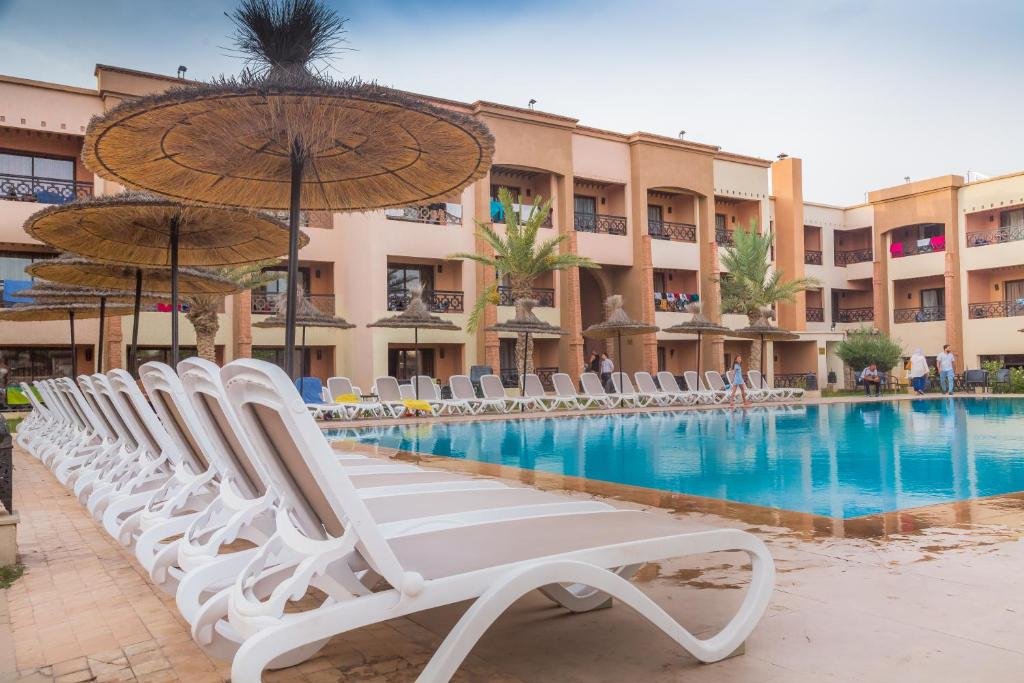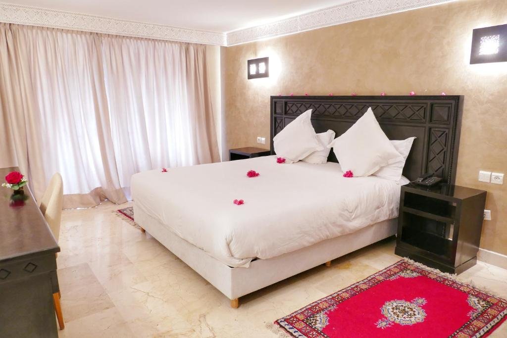 The hotel features a large outdoor swimming pool, a wellness spa with hammam and massage treatments, a fully equipped fitness center, and several dining options serving Moroccan and international cuisine.